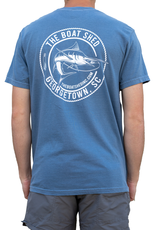 Catching a Blue Marlin is the pinnacle of saltwater Fishing! This comfort color shirt is 100% cotton and available in blue or seafoam.