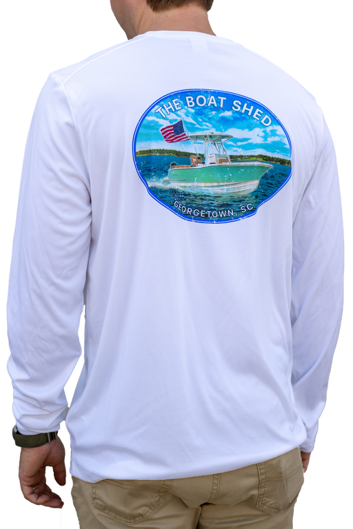 Nothing says freedom like a summertime boat ride! This design features the Pioneer 222 Islander proudly waving Old Glory. This shirt is a Sport-Tek...